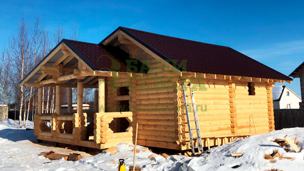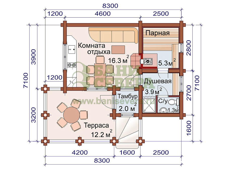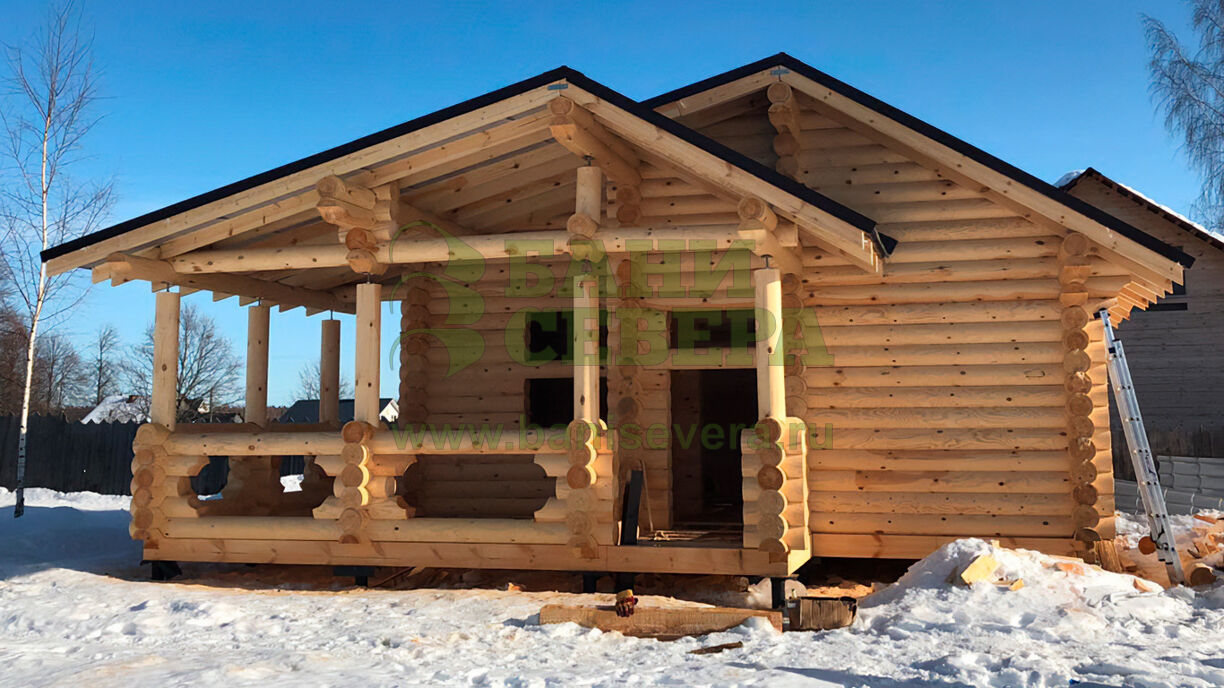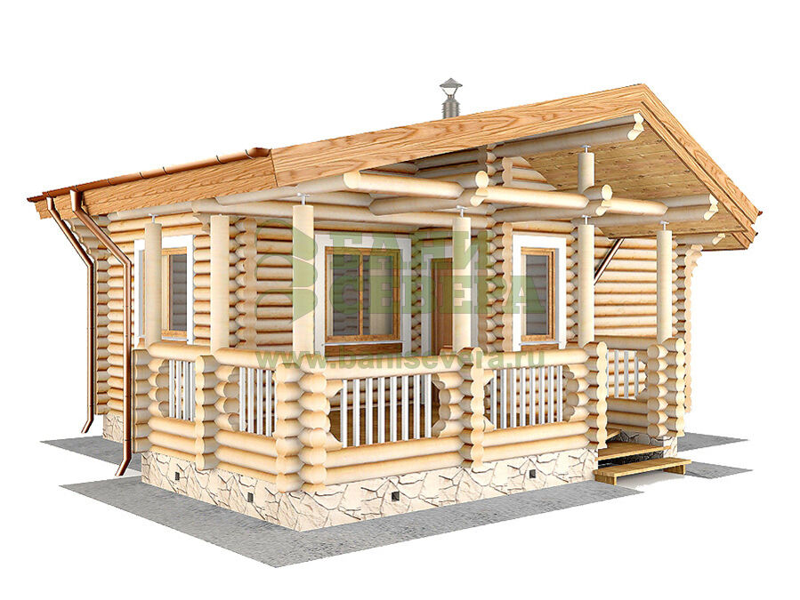 Проект одноэтажной бани из оцилиндрованного бревна площадью 46,0м² и габаритами 8,3×7,1м. Построим эту баню для Вас в Ленинградской области.
